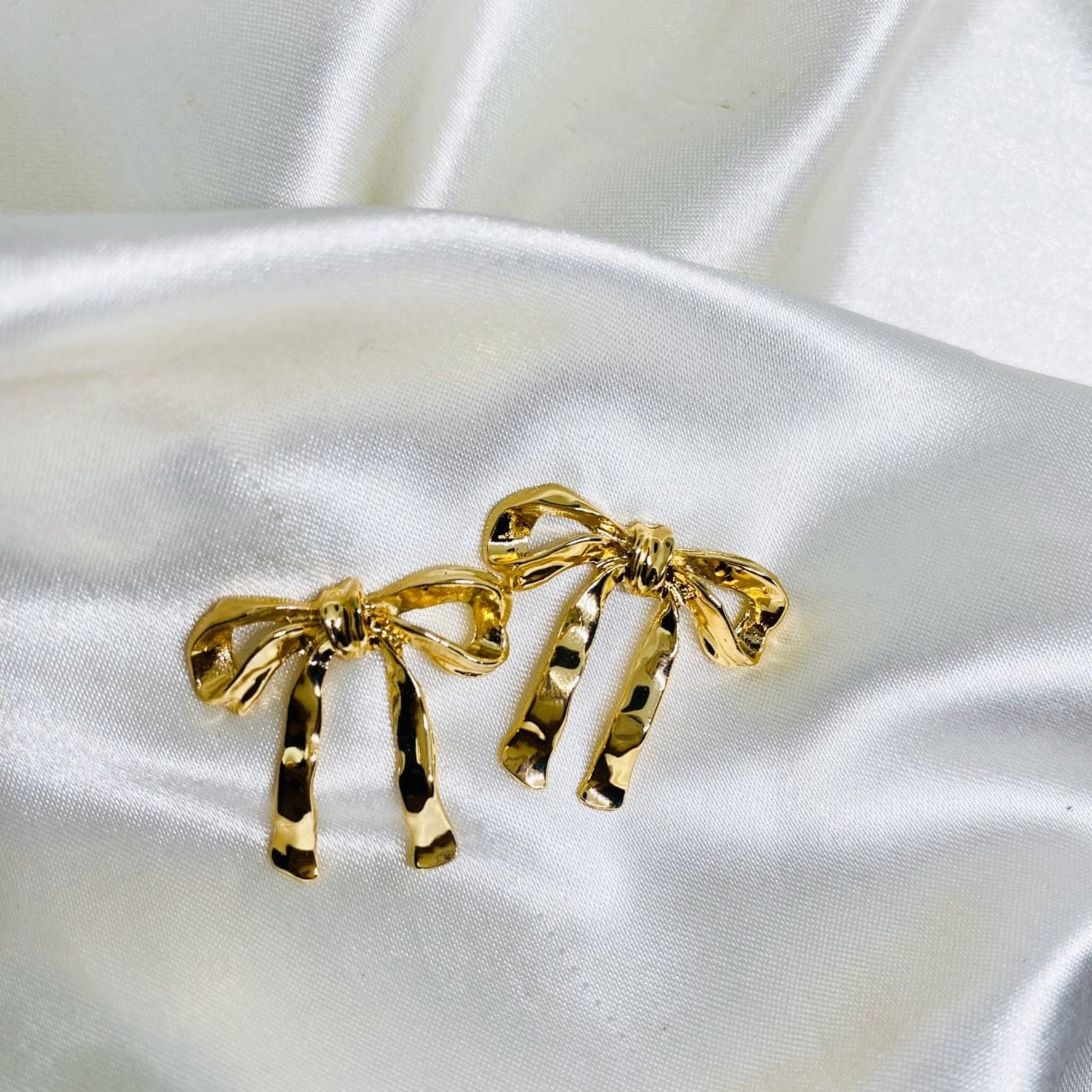 The Molten Bow Drops are a bold take on a feminine classic. Featuring sculpted, hammered ribbon-like strands that glisten with every move, these earrings blend elegance with a touch of edge. The high-polish gold finish adds luxury, while the fluid bow design keeps it chic and modern. Wear them to elevate your look for parties, festive dinners, or a stylish night out. They're playful yet powerful — a true statement piece with charm.