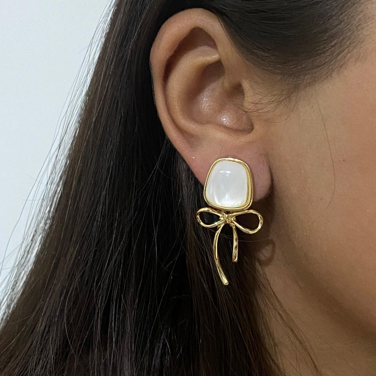 Delicate yet dazzling, the Pearl Ribbon Charm earrings feature a luminous shell-like stone paired with an elegant gold ribbon drop. These earrings bring together graceful femininity and contemporary flair—perfect for brunches, casual celebrations, or adding a chic touch to your everyday outfits. Light, graceful, and effortlessly stylish.